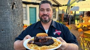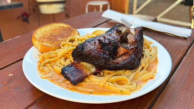 That’s how the chipotle alfredo pasta with a beef rib topper was born. “A smorgasbord of flavors in your mouth, man,” said Chuck. “It just the pasta, all the chipotle flavors and all this stuff, and then that dino rib, the way he cooks it here, man, he smokes it. It just melts and combines with the chipotle. Oh man. Even talking about it, I’m just mouth watering.”