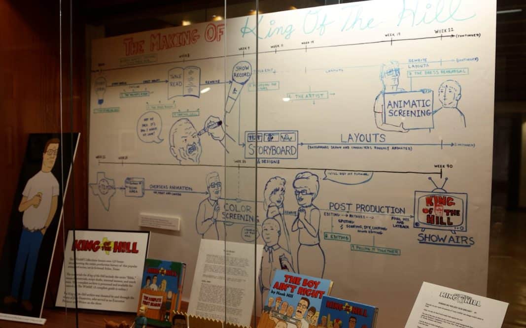When it comes to cartoons, you can’t really get much more Texan than King of the Hill. “Gosh, we love King of the Hill,” said David. “The kids here at Texas State love King of the Hill. One of our favorite things about it is what we have front and center is this bible, as it was called. It was a guide to the writers all about Arlen, Texas, which of course doesn’t exist, but it certainly exists in a lot of Texans mind. It was about how the characters would act, what the characters would say, how to draw the characters, what they would look like. Things to do and things to never do or have these characters do.”
