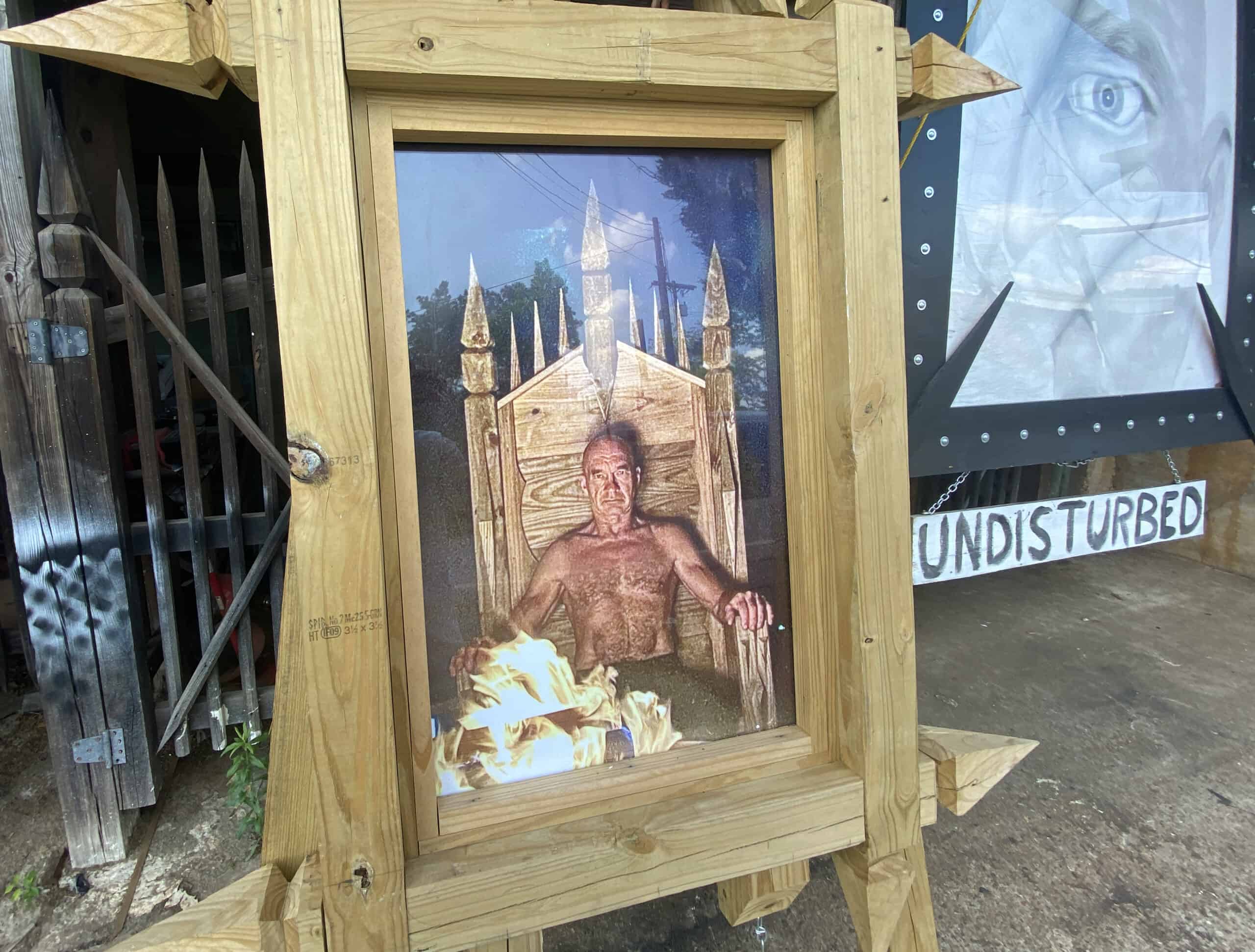 Rising above the trees of East Texas, this deck is 56 feet tall, and it’s surrounded by Gary’s art, including one provocative portrait of himself, which makes him look like a Bond villain.