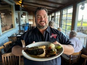 Chris wanted to showcase three dishes at the Yardarm, some old, some new, so we started with Oysters Rockefeller. Fresh gulf oysters are topped with bacon, spinach, onion and garlic and placed in the oven. Then comes the fresh flounder. “This was probably right around yesterday, or the night before,” said Chris. “Been gigged right here, you can tell.”