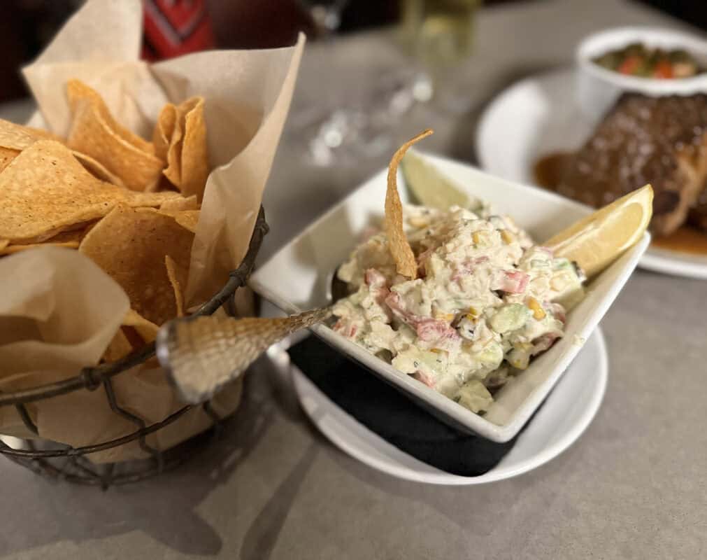 Add collard greens, mashed potatoes and brown gravy and good gravy we’re almost ready. All that’s left is a side of the crab ranchero dip. A mixture of avocado, roasted corn, pico, ranch, and of course, fresh crab. “Voila,” said Anthonie. ““Wagyu akaushi beef meatloaf.”